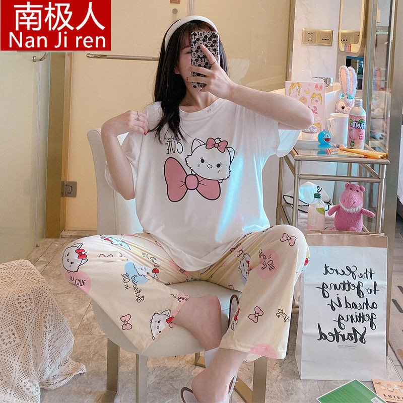 طقم نوم كاجوال نسائي من قطعتين برقبه دائرية وكمام قصيرة